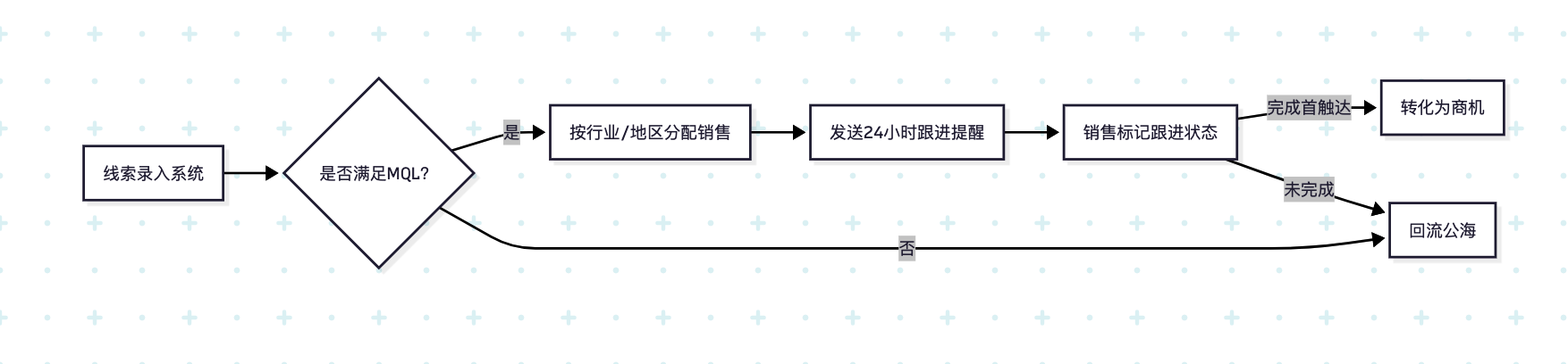 MQL标准(评分≥65分+需求明确);24小时未响应回流公海 |