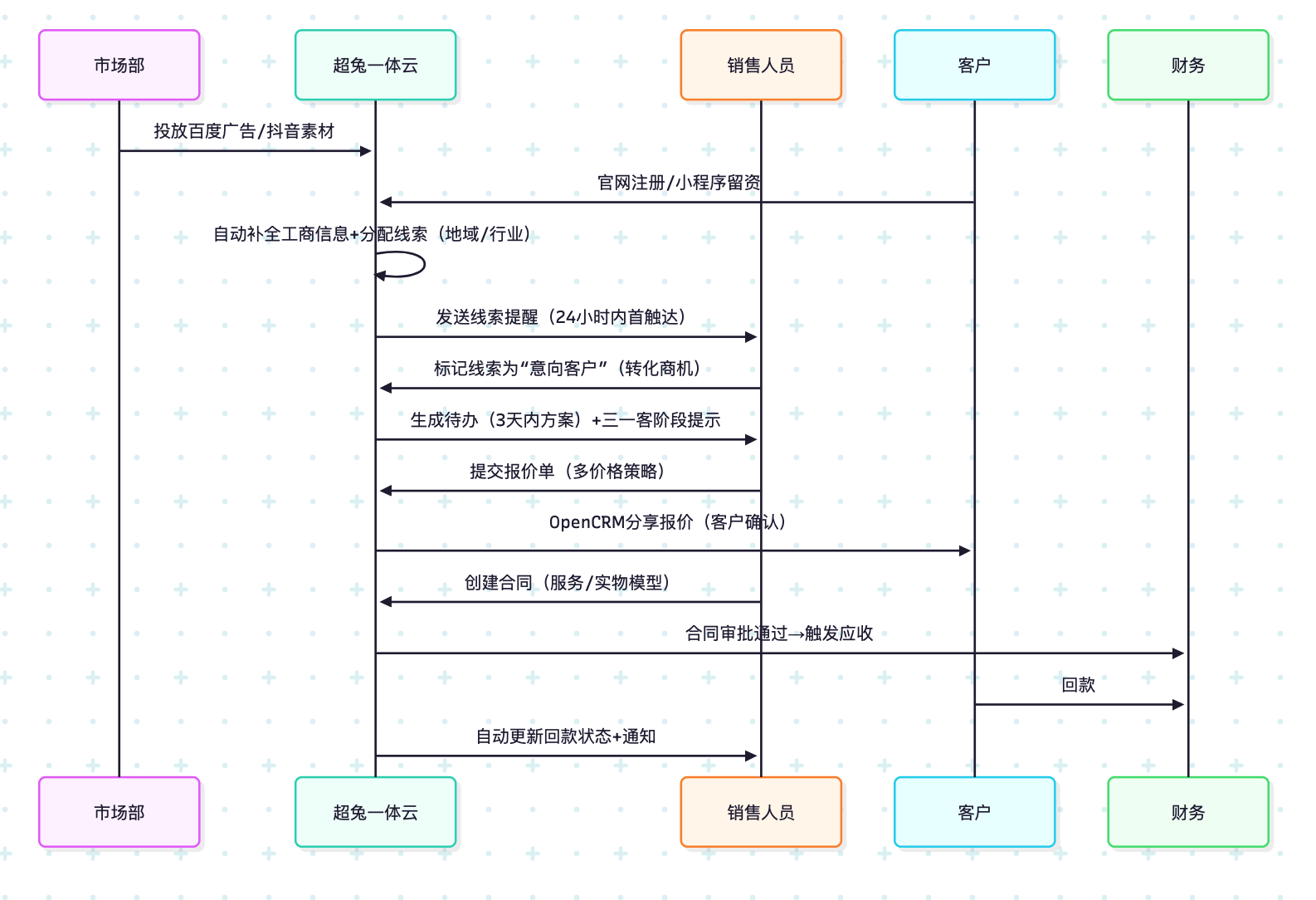 通过Mermaid时序图展示超兔的全链路自动化流程: