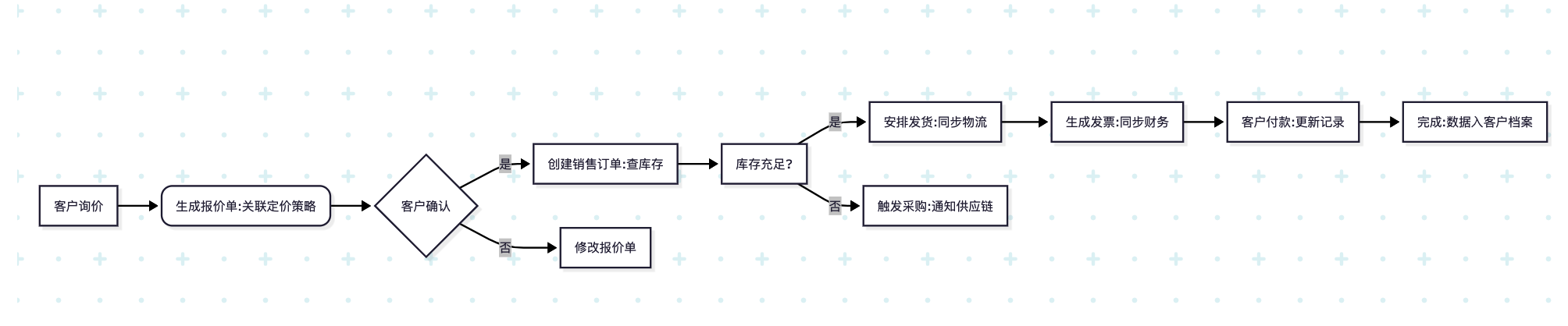 行业需求:企业需要全链路流程覆盖(询价到成交)、关键节点可控(避免遗漏)、数据集成(联动库存/财务)、AI辅助(降低人工成本)。