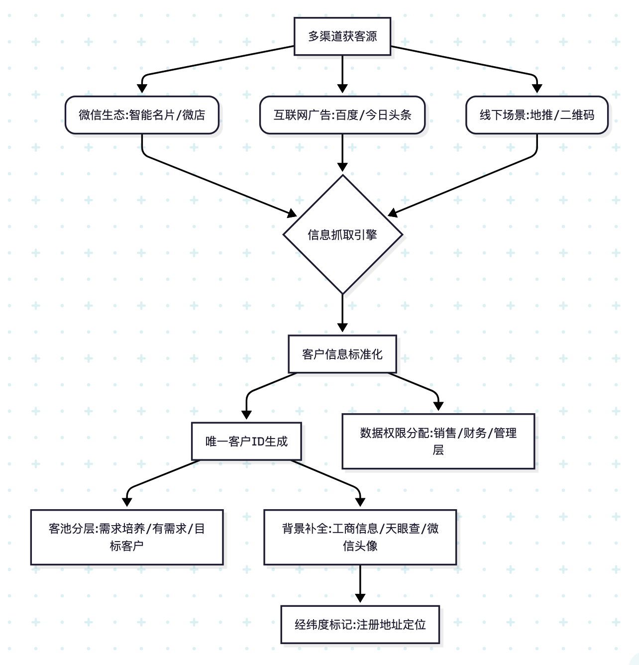 ① 多渠道信息100%自动化整合;② 支持“客户背景调查”(天眼查/微信头像);③ 客池分层精准匹配跟进策略 |