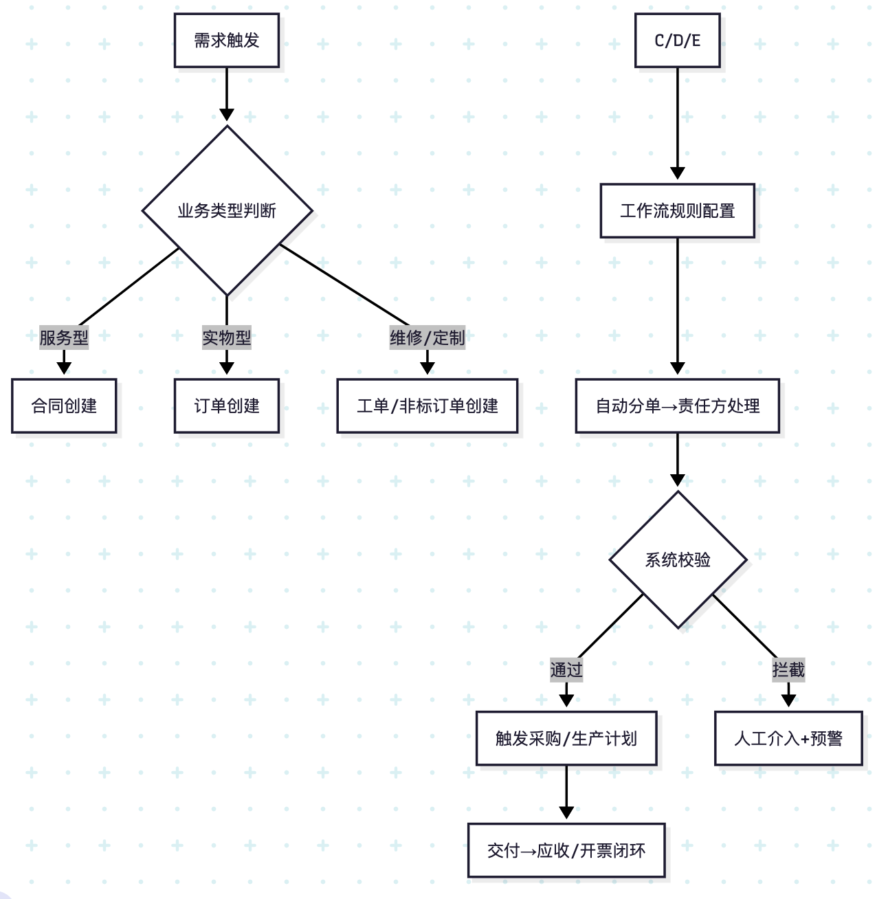 支持业务模型动态切换,适配混合业务场景(如制造业“订单-生产-售后”闭环) |