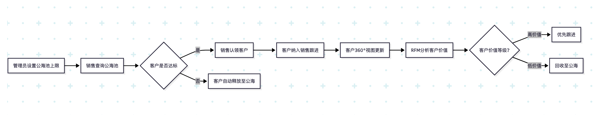 公海池资源领用上限控制、客户价值“三一客”评估(定性/定级/定量)、RFM分析高价值/流失风险客户 |