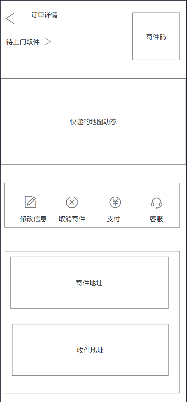 界面由主界面,寄件界面,取件界面等组成,画面简单易懂。用户可以在主界面选择寄件还是取件,如果选择寄件会跳转到寄件页面,在此界面中,您可以填写您的寄件取件地址,并可以估计寄件的费用,如果您觉得可以,就可以点击立即下单,快递员接到通知后会安排时间上门取货,此时您可以在当前的跳转页面支付邮费,如果您的地址填写错误,我们也支持临时修改地址功能,如果有其它问题可以咨询客服 进行答疑。