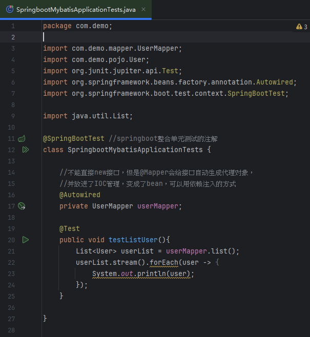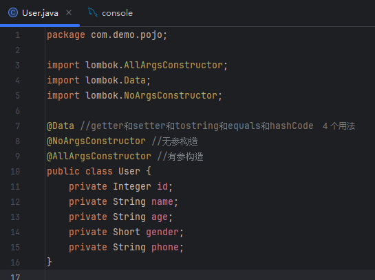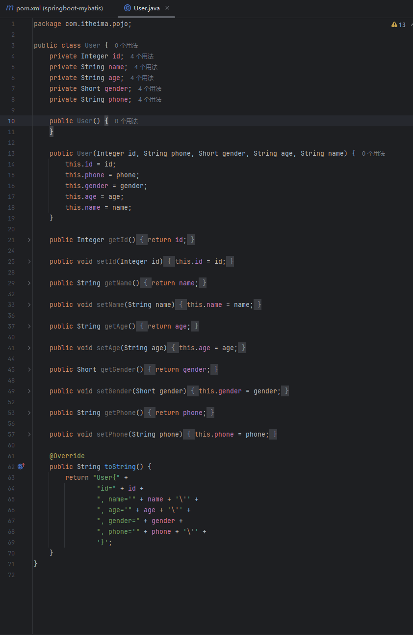 根据数据库表写User实体类私有变量,右键生成getter和setter方法,在变量后面新建含参和无参构造函数,在最后生成tostring方法(摁着ctrl鼠标多选)