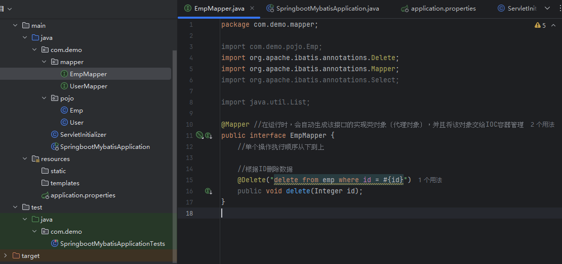 2删除更简单都不用实体类直接赋值给Mapper接口的形参为Integer的删除方法,也是赋值#{},数据库删除数据,不返回