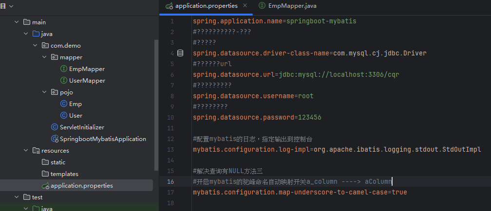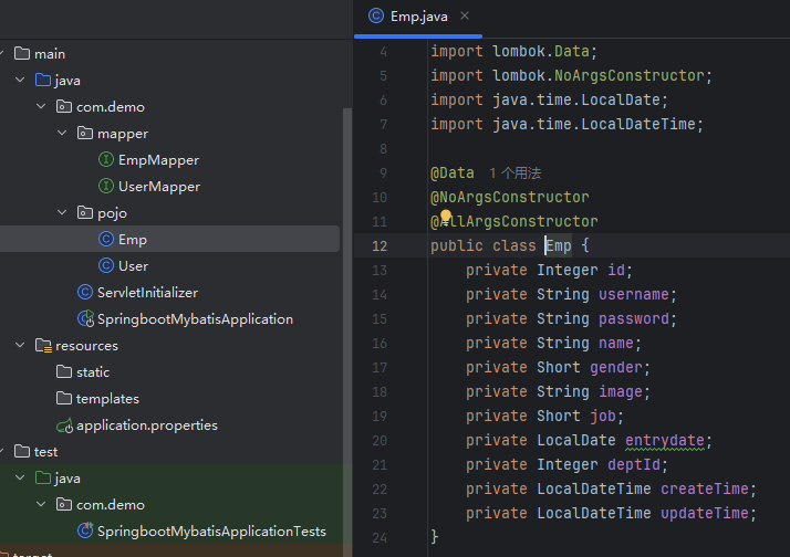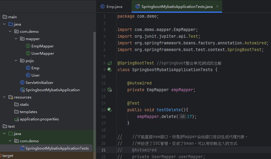 简单来说就是测试类调用接口对象进行数据增删改查,多了个Emp实体类是用来临时存放数据的,