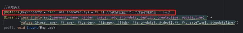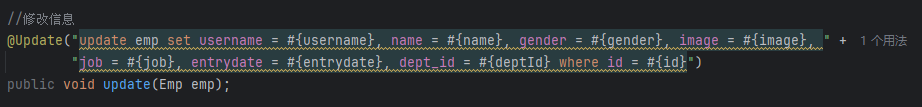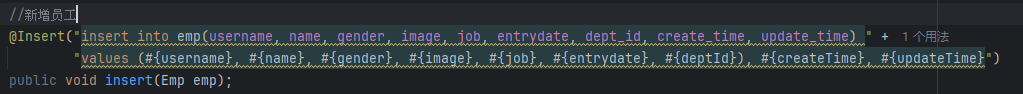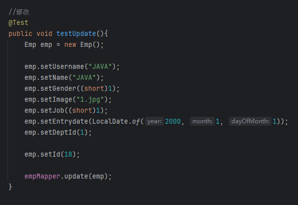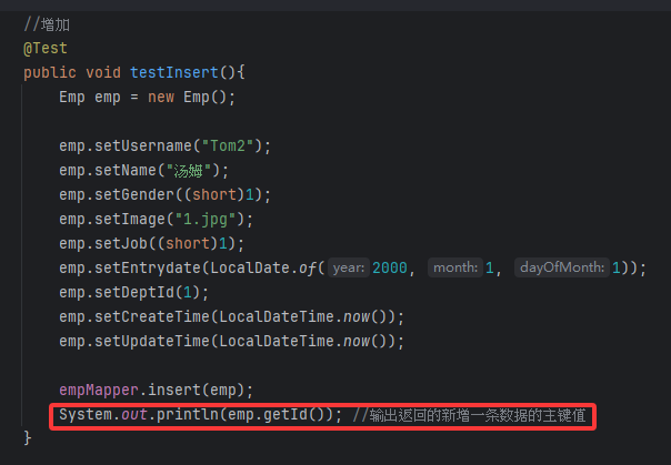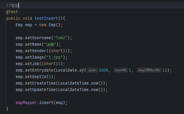 1增加就是在测试类创建Emp类型的对象,把属性值存放进去,然后赋值给Mapper接口的形参为Emp类型的增加方法,增加方法接收到对象之后把属性值一一赋值给SQL对应#{},最后数据库增加数据,增加方法不返回。