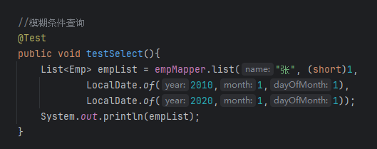 5模糊查询获取多条数据是在测试类直接赋值给Mapper接口的对应形参,然后赋值给对应#{}之后获取到数据,然后以Emp类型对象的List集合的形式返回给测试类,测试类接收到数据后赋值给相同Emp对象的List集合里并命名集合变量为empList,输出empList