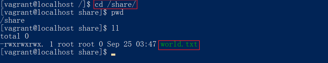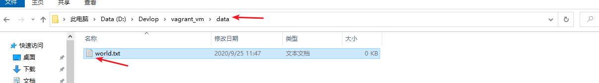 Vagrantfile文件需要执行vagrant reload重启。重启后我们在data文件夹下新建一个world.txt文件,然后连接虚拟机看看是否共享成功: