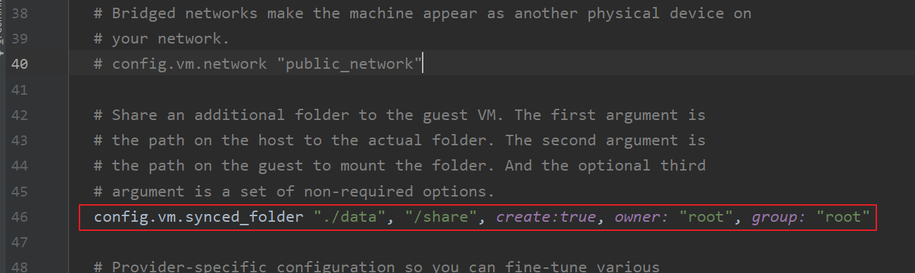 config.vm.synced_folder "./data", "/share", create:true, owner: "root", group: "root"