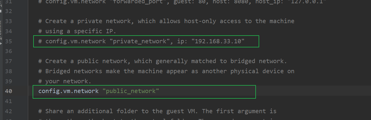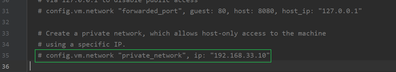 Vagrantfile,将我们刚刚开启的私有网络配置注释,然后开启下面这行配置: