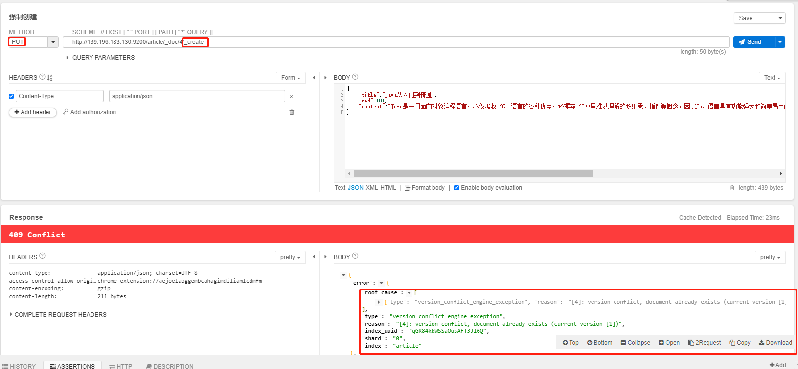 在上面的学习中,我们发现,替换文档和创建文档的 API 是一样的,这就意味着,我们在创建文档的过程中,可能这个文档其实已经存在了,但是我们不知道,通过创建的 API 直接把该文档进行了替换,这不是我们想要的结果,因此需要使用强制创建