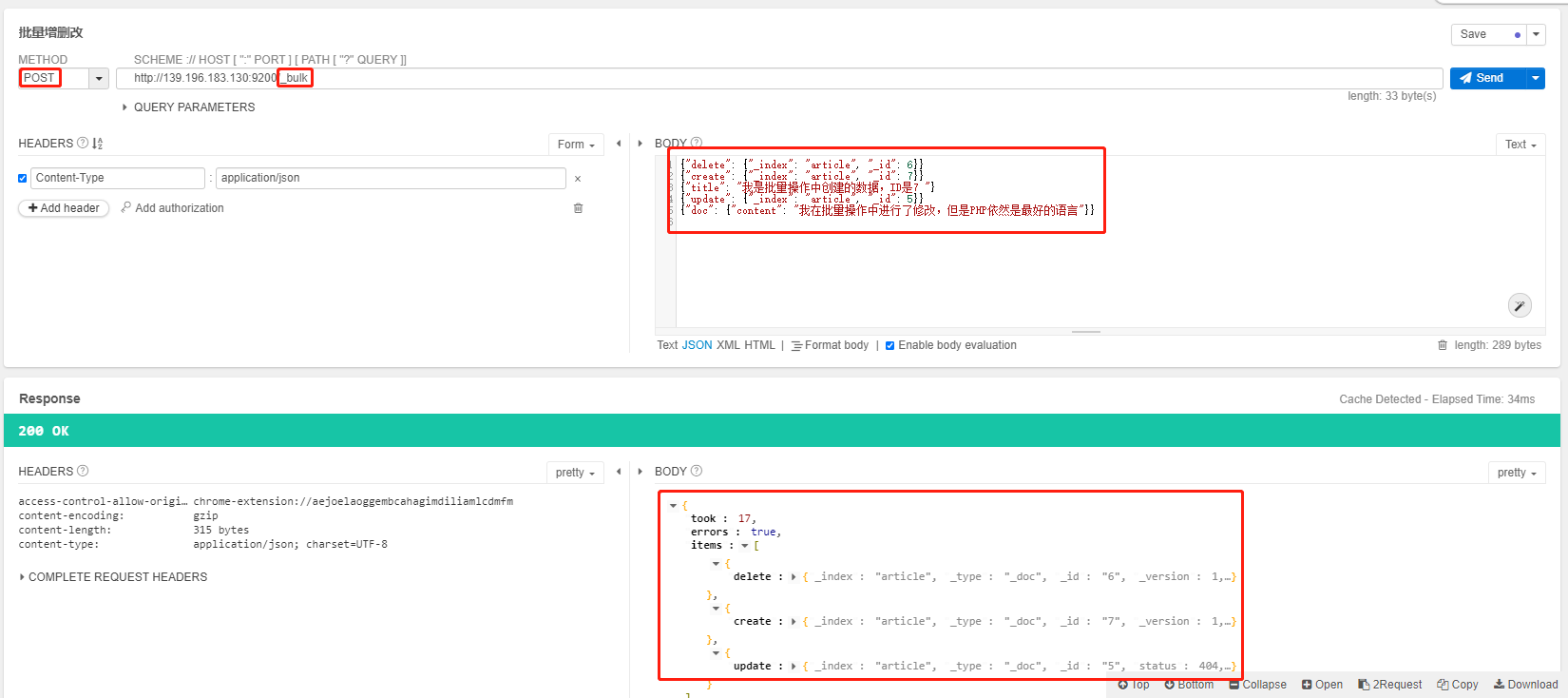 _bulk操作的形式是多个 JSON,每个 JSON 写完必须换行,而在 JSON 内则不可以换行- 多个 JSON 之间操作互不影响,即使前面的报错了,其他行也可以正常执行