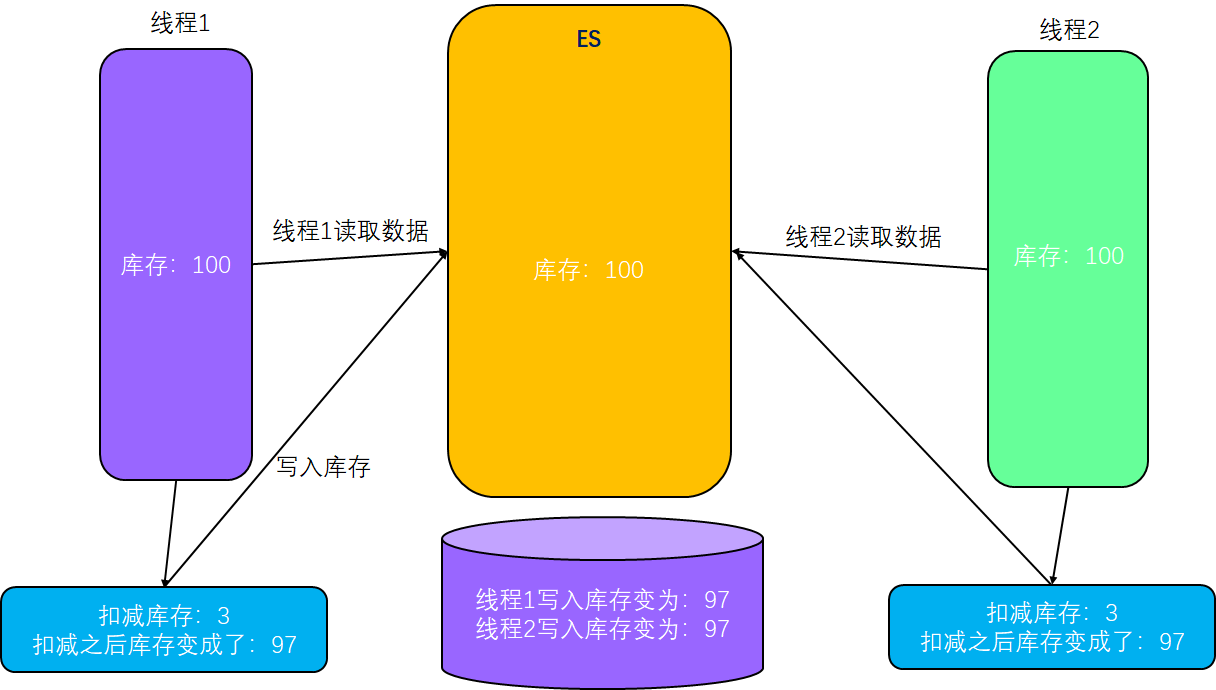 - 举个例子,我跟你在淘宝在同一时间下单买了同一本书,两个线程同时去 es 扣这本书的库存,库存有 100 本书,正常情况扣完库存后应该变成 98 本,但如果两个线程同时扣减就会有并发冲突,就会变成这样如下例子