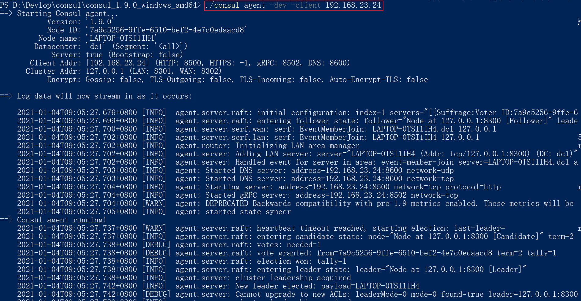 nohup ./consul agent -data-dir D:/Devlop/consul/conf -node=192.168.2.143 -bind=192.168.2.143 -datacenter=dc1 -ui -client=192.168.2.143 -server -bootstrap-expect 1 &