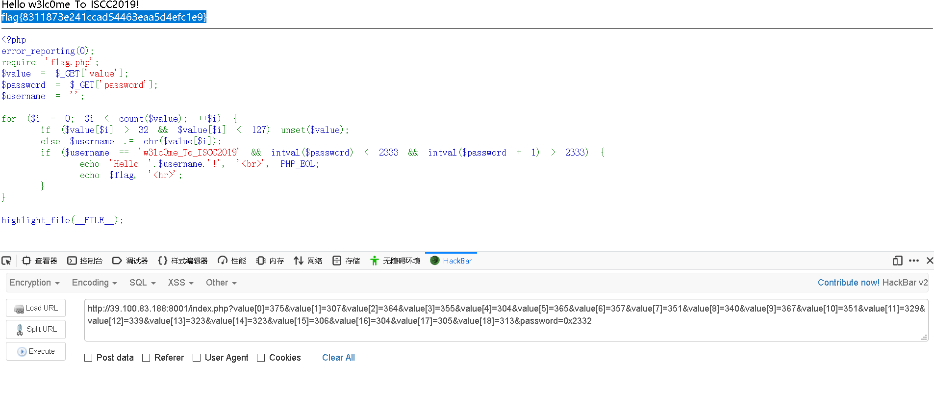 代码审计一波,就是传入数组,并且组成''w3lc0me_To_ISCC2019'',但是问题来了,要绕过$value[$i] > 32 && $value[$i] < 127,然后再chr变回字符,一开始我想用16进制或者8进制试试,发现不行。