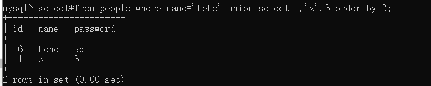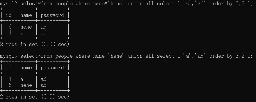 test3:order by 3,2,1如果第三列相同,则比较第二列(题目中已得到第二列,若passwrod第一位相等,呢么按照order by出来的一定是新条目,因为数字先字符)