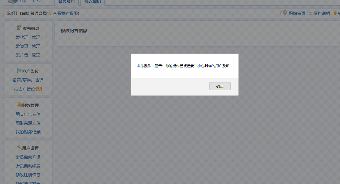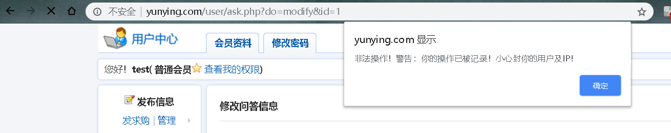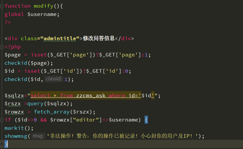 function modify(){ global $username; ?> <div class="admintitle">修改问答信息</div> <?php $page = isset($_GET['page'])?$_GET['page']:1; checkid($page); $id = isset($_GET['id'])?$_GET['id']:0; checkid($id,1); $sqlzx="select * from zzcms_ask where id='$id'"; $rszx =query($sqlzx); $rowzx = fetch_array($rszx); if ($id<>0 && $rowzx["editor"]<>$username) { markit(); showmsg('非法操作!警告:你的操作已被记录!小心封你的用户及IP!'); } ?>