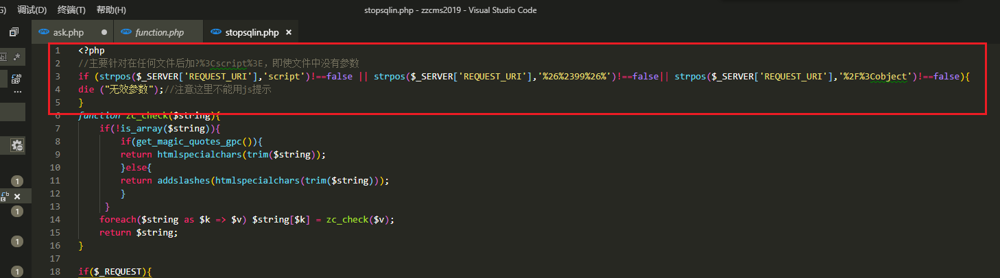 使用<sCrIpT>alert(/xss/)</ScRiPt>是因为在/inc/stopsqlin.php中有一段检测函数