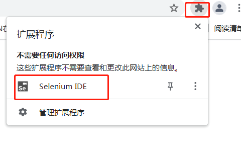 安装好之后,打开扩展程序找到我们安装好的selenium ide,打开: