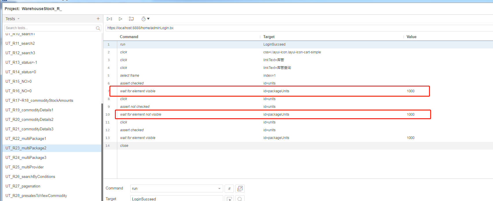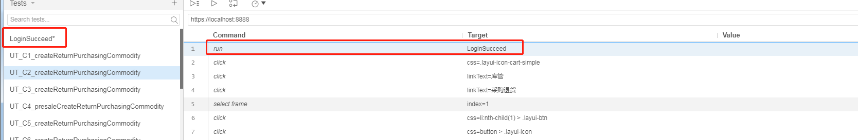 1、run:可调用一个已录制好的脚本,在target中写入所调用脚本的单名称。比如先录制好一个login的脚本,然后在其他页面操作用例开始前调用这个login脚本,再右键insert new command,选中新增加的command行,右键选择record from here,就不用在每个用例都去录制登录的操作。这样一来,测试不同场的博销宝时,就只要修改login脚本里的登录网址就行了。