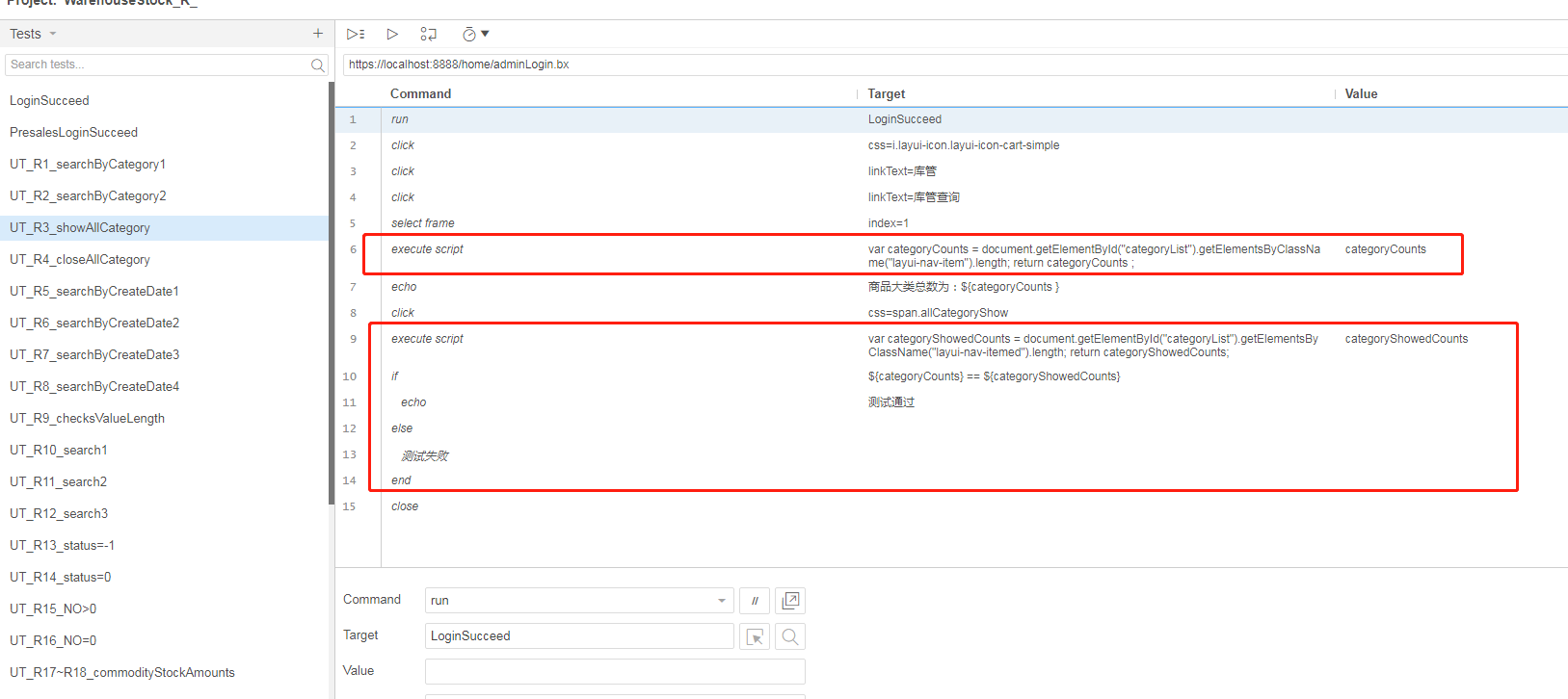 2、execute script:执行自己写的脚本,一般用于做结果验证的时候。比如测试全部类别展开时,人工测试是可以肉眼观察所有类别是否都已展开的,单selenium没提供相关的内置命令去让你验证所有类别是否都已展开。此时可以先使用该命令,自己编写脚本(如原生js),先获取类别个数,然后展开后再获取展开的类别个数(一般展开的会有另一个css类名),将两者进行对比即可以做结果验证。
