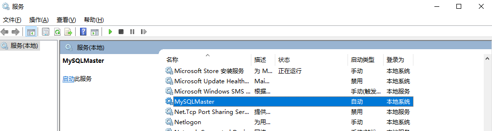 这样在windows服务就可以看到安装好了的MySQL服务,在这里可以启动MySQL服务,或者在cmd窗口通过net start MySQLMaster启动