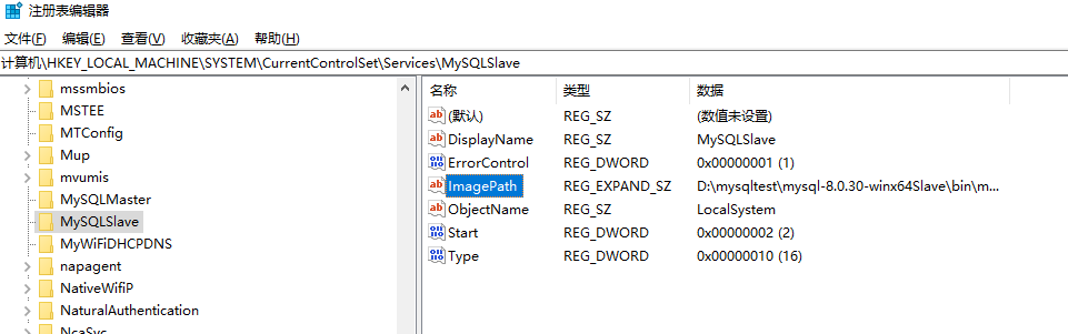 注意如果前面设置mysql的环境变量,会用到同一个mysqld.exe,此时需要修改注册表,运行regedit打开注册表,检查MySQL服务是否对应mysqld