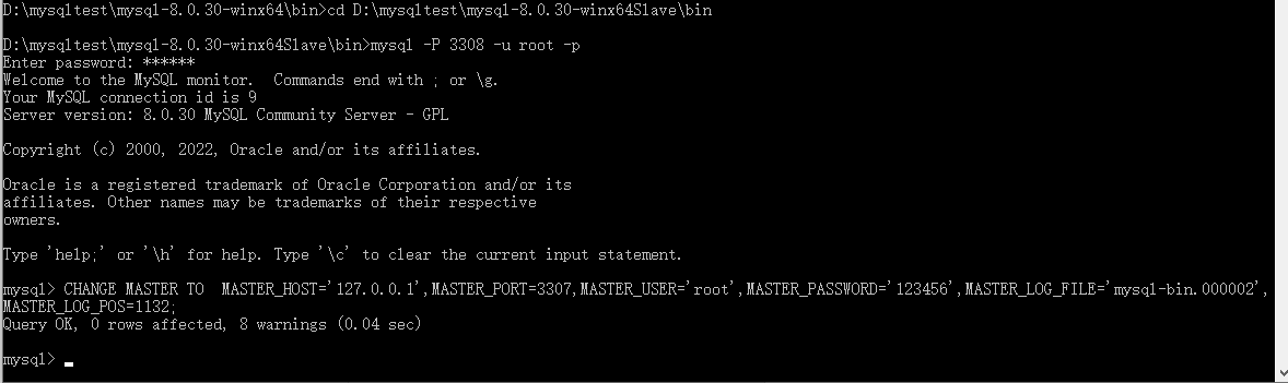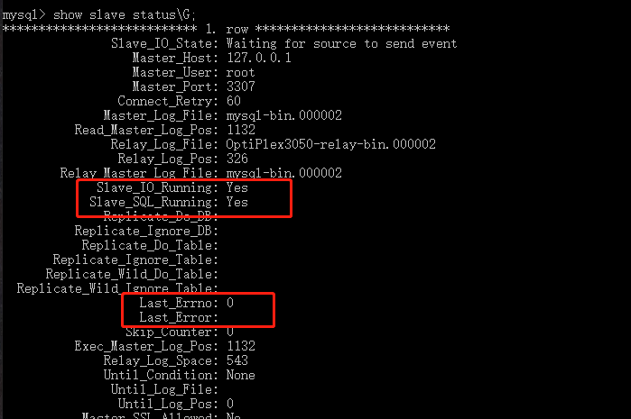MASTER_HOST='127.0.0.1',MASTER_PORT=3307,MASTER_USER='root',MASTER_PASSWORD='123456',MASTER_LOG_FILE='mysql-bin.000002',MASTER_LOG_POS=1132;