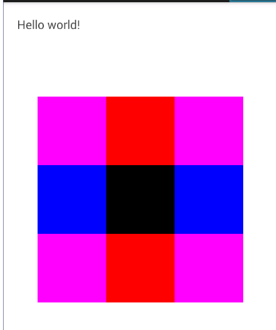 <?xml version="1.0" encoding="utf-8"?> <RelativeLayout xmlns:android="http://schemas.android.com/apk/res/android" xmlns:app="http://schemas.android.com/apk/res-auto" xmlns:tools="http://schemas.android.com/tools" android:layout_width="match_parent" android:layout_height="match_parent" tools:context=".MainActivity"> <Button android:id="@+id/btn1" android:layout_width="80dp" android:layout_height="80dp" android:layout_centerInParent="true" android:background="#121bb2" /> <Button android:id="@+id/btn2" android:layout_width="80dp" android:layout_height="80dp" android:layout_centerInParent="true" android:layout_above="@id/btn1" android:background="#111111" /> <Button android:id="@+id/btn3" android:layout_width="80dp" android:layout_height="80dp" android:layout_centerInParent="true" android:layout_below="@id/btn1" android:background="#6eb286" /> <Button android:id="@+id/btn4" android:layout_width="80dp" android:layout_height="80dp" android:layout_centerInParent="true" android:layout_toLeftOf="@id/btn1" android:background="#FF0000" /> <Button android:id="@+id/btn5" android:layout_width="80dp" android:layout_height="80dp" android:layout_centerInParent="true" android:layout_toRightOf="@id/btn1" android:background="#64231e" /> <Button android:id="@+id/btn6" android:layout_width="80dp" android:layout_height="80dp" android:layout_centerInParent="true" android:layout_toLeftOf="@id/btn2" android:layout_above="@id/btn4" android:background="#993593" /> <Button android:id="@+id/btn7" android:layout_width="80dp" android:layout_height="80dp" android:layout_centerInParent="true" android:layout_toRightOf="@id/btn2" android:layout_above="@id/btn5" android:background="#847950" /> <Button android:id="@+id/btn8" android:layout_width="80dp" android:layout_height="80dp" android:layout_centerInParent="true" android:layout_toRightOf="@id/btn3" android:layout_below="@id/btn4" android:background="#8497" /> <Button android:id="@+id/btn9" android:layout_width="80dp" android:layout_height="80dp" android:layout_centerInParent="true" android:layout_toLeftOf="@id/btn3" android:layout_below="@id/btn4" android:background="#5657" /> </RelativeLayout>