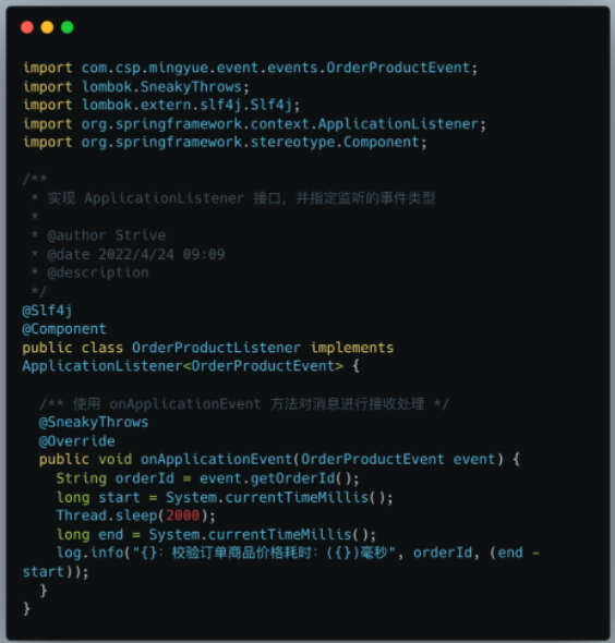 监听并处理事件,实现 ApplicationListener 接口或者使用 @EventListener 注解