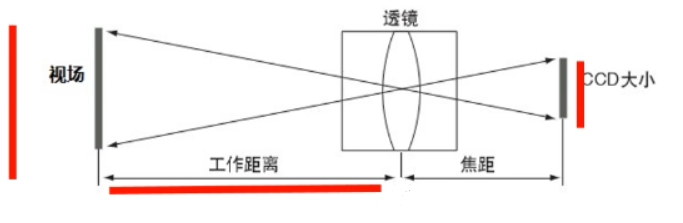 在已知相机CCD尺寸、工作距离(WD)和视野(FOV)的情况下,可以计算出所需镜头的焦距(f)。