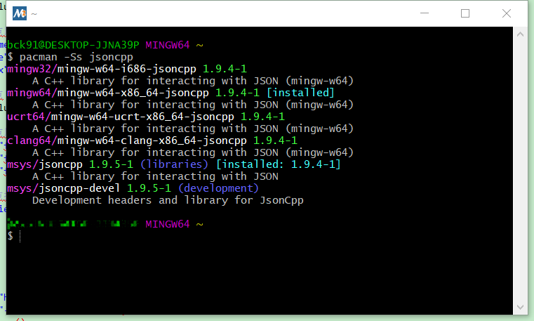 然后使用pacman -S <自己所需要的包名>,比如pacman -S mingw-w64-x86_64-jsoncpp