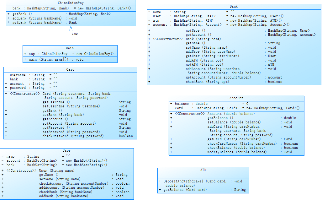 对于后两次的题目,相较于前几次,这次题目并没有给出类之间的关系,因此需要我们自己设计。尤其是第一题,主要的知识点便是考察类与类之间的关系的设计,再者就是类的封装性。主要的类有银联、银行用户以及账户、银行卡、ATM等类。开始的想法是类中包含各个银行,银行之中包含银行用户,用户有多个账户,因此账户包含在用户中,在账户上有多张银行卡,而ATM包含在银行中。但后来才知道这种设计并不是很合理。经过修改后,用户并不包含在银行中,账户不仅包含在用户中,还直接包含在银行中。