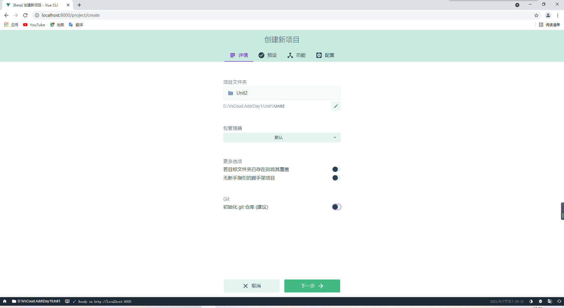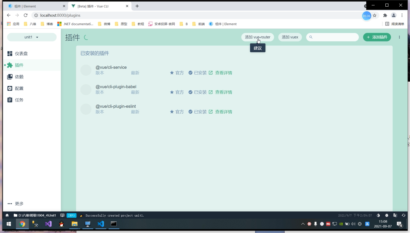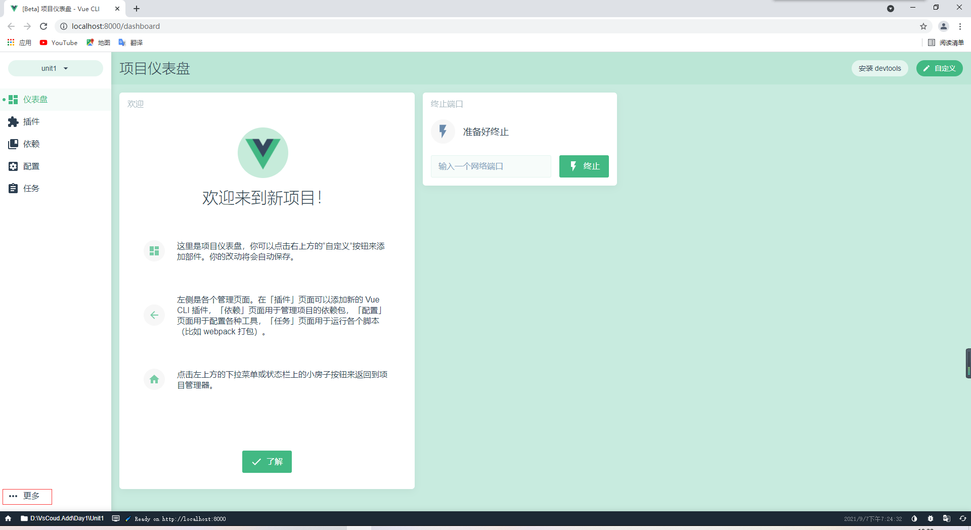 1.1 Win+R键打开运行窗口,默认输入cmd 在输入框输入 vue ui 打开一个浏览器窗口 左下角点击更多=>Vue项目管理器=>输入新项目位置路径=>输入新项目名称=>取消勾选git仓库=>选择默认=>创建新项目=>插件=>添加vue-router