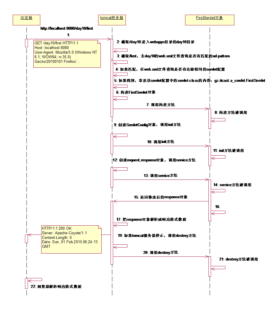 Tomtcat内部代码运行: 1)通过映射找到到servlet-class的内容,字符串: com.itmayiedu.a_servlet.FirstServlet 2)通过反射构造FirstServlet对象 2.1 得到字节码对象 Class clazz = class.forName("com.itmayiedu.a_servlet.FirstServlet"); 2.2 调用无参数的构造方法来构造对象 Object obj = clazz.newInstance(); ---1.servlet的构造方法被调用 3)创建ServletConfig对象,通过反射调用init方法 3.1 得到方法对象 Method m = clazz.getDeclareMethod("init",ServletConfig.class); 3.2 调用方法 m.invoke(obj,config); --2.servlet的init方法被调用 4)创建request,response对象,通过反射调用service方法 4.1 得到方法对象 Methodm m =clazz.getDeclareMethod("service",HttpServletRequest.class,HttpServletResponse.class); 4.2 调用方法 m.invoke(obj,request,response); --3.servlet的service方法被调用 5)当tomcat服务器停止或web应用重新部署,通过反射调用destroy方法 5.1 得到方法对象 Method m = clazz.getDeclareMethod("destroy",null); 5.2 调用方法 m.invoke(obj,null); --4.servlet的destroy方法被调用