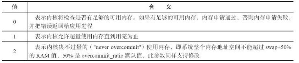 - Redis是内存操作,需要优先使用内存。设置overcommit 为1。是为了让 fork 操作能够在低内存下也执行成功。Linux 操作系统对大部分申请内存的请 求都回复 yes,以便能运行更多的程序。因为申请内存后,并不会马上使用内存,这种技术叫做 overcommit。 vm.overcommit_memory 用来设置内存 分配策略,有三个可选值