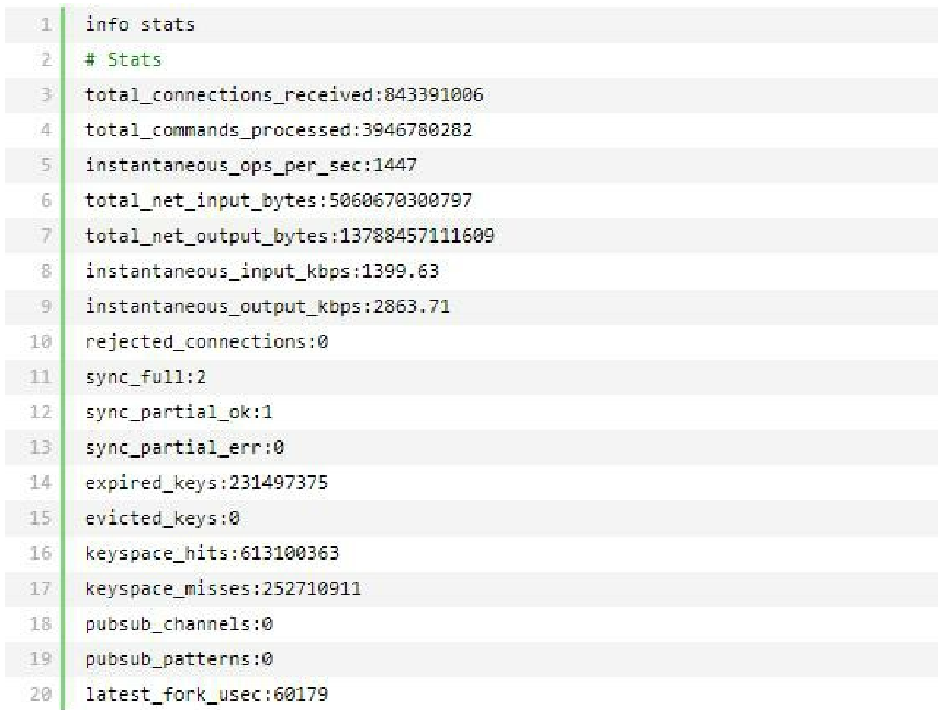 比如可以写个脚本,定期记录total_commands_processed的值。当客户端明显发现响应时间过慢时,可以通过记录的total_commands_processed历史数据值来判 断命理处理总数是上升趋势还是下降趋势,以便排查问题 在info信息里的 total_commands_processed字段显示了Redis服务处理命令的总数