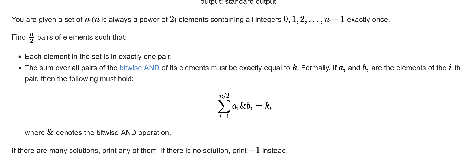 给一对数,n和k,让你找 用0 - n-1 的数字组成n/2对,每对& 后相加要等于 k