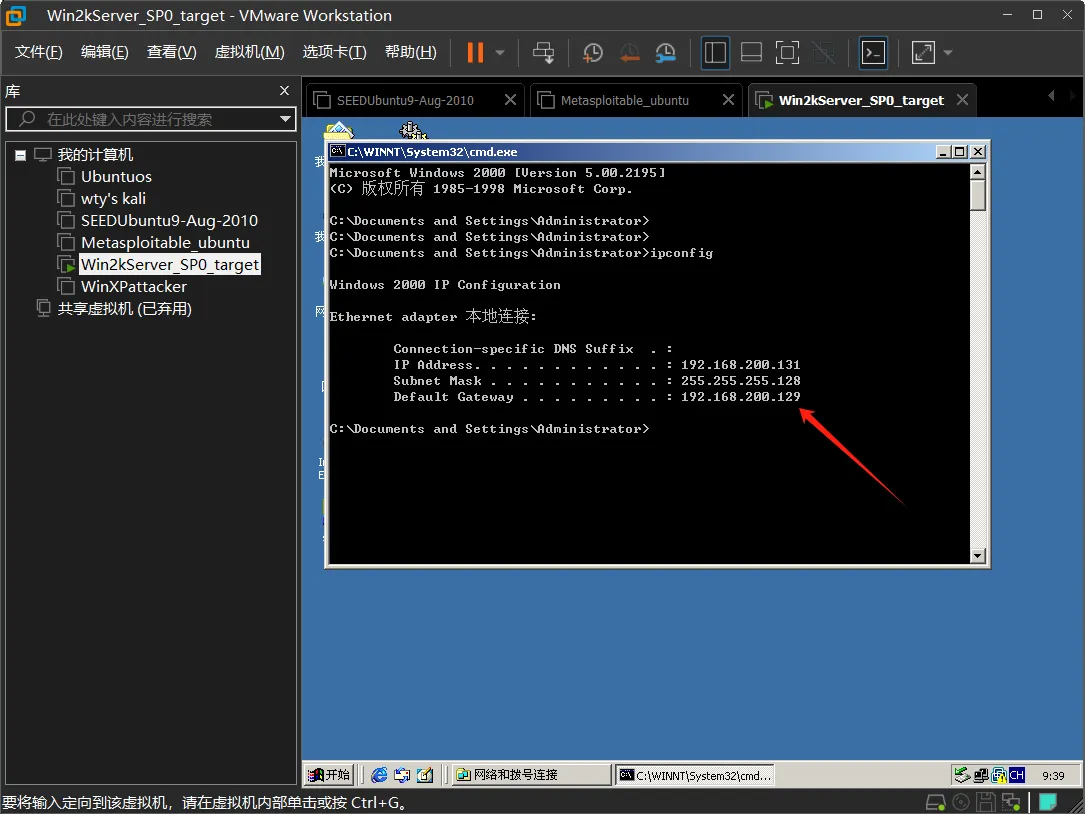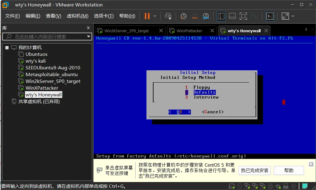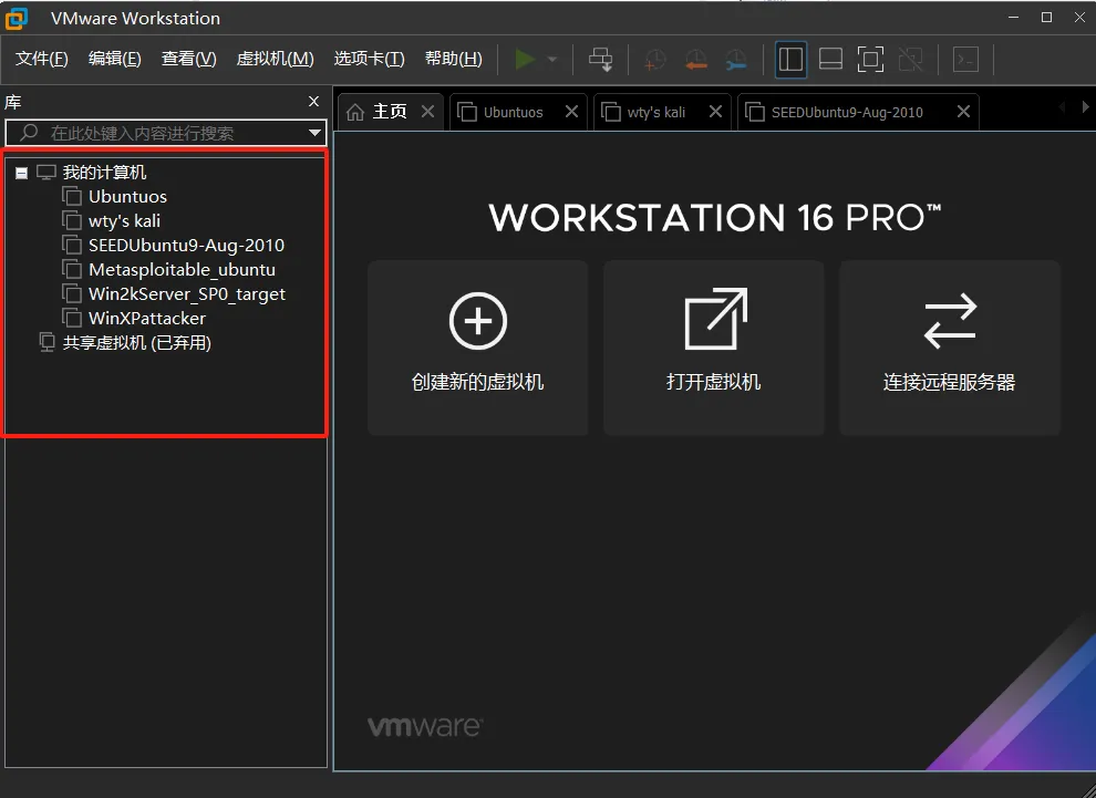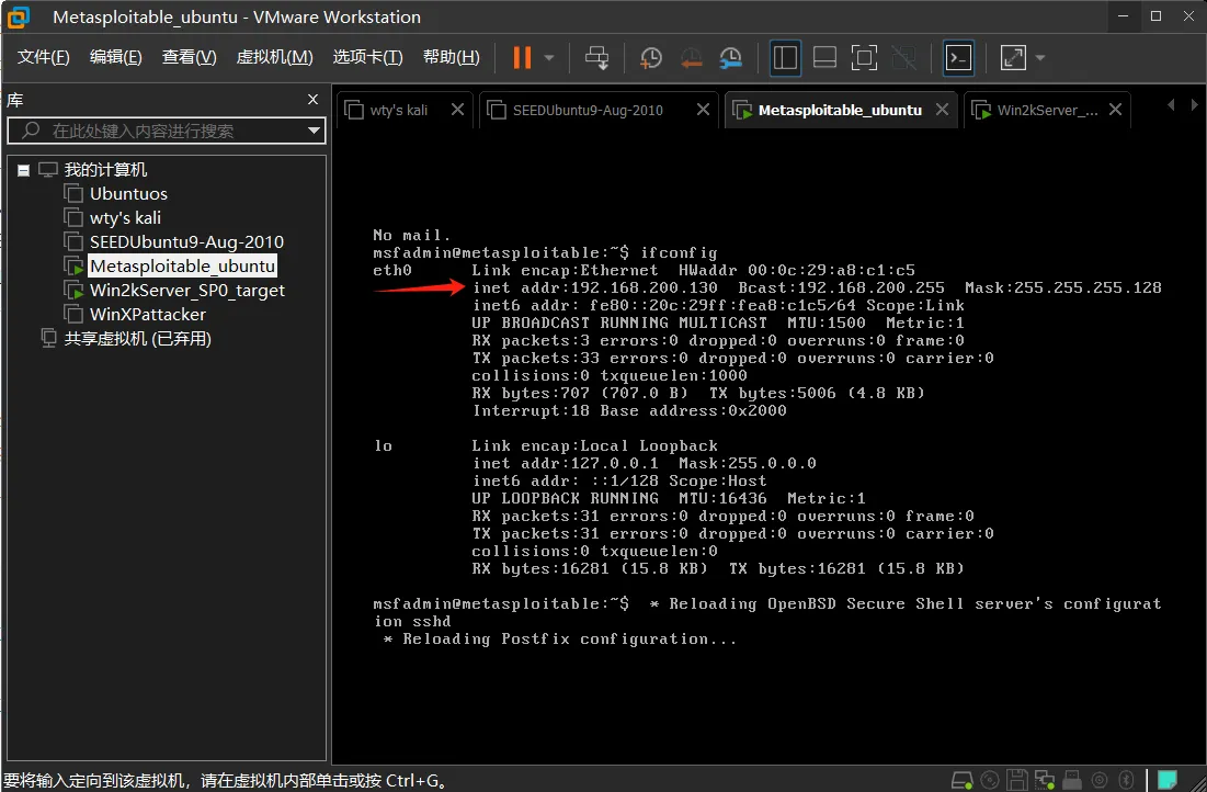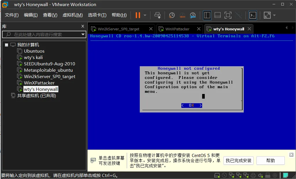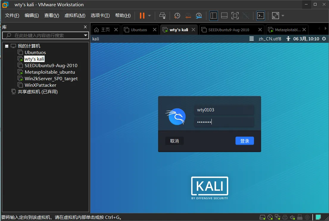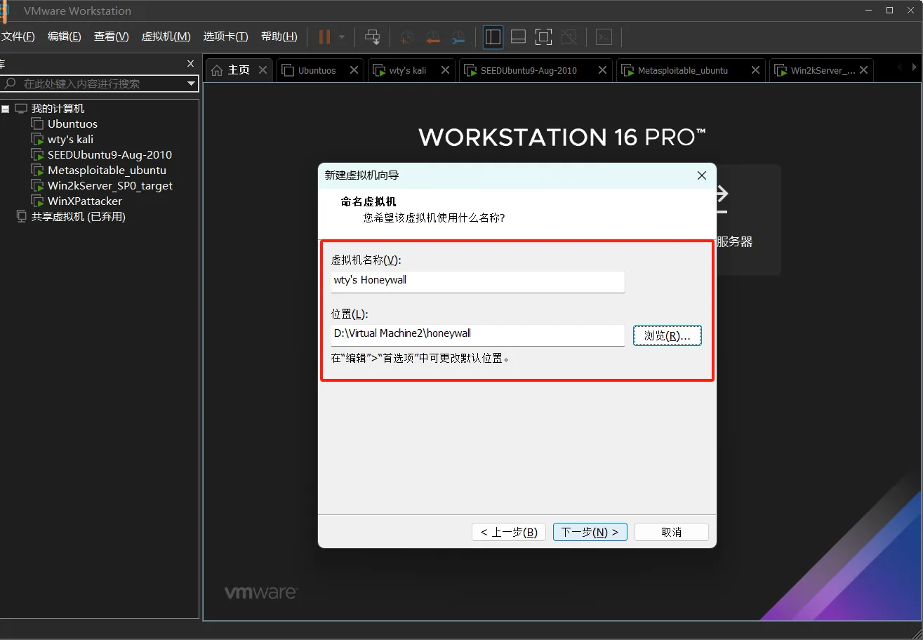 如图所示,导入课堂提供的虚拟机资源,将其复制到本地上的VMware Workstation,其中的攻击机wty's kali是之前我安装好的,这里便省略了kali攻击机的安装过程,其余虚拟机使用了老师提供的资源