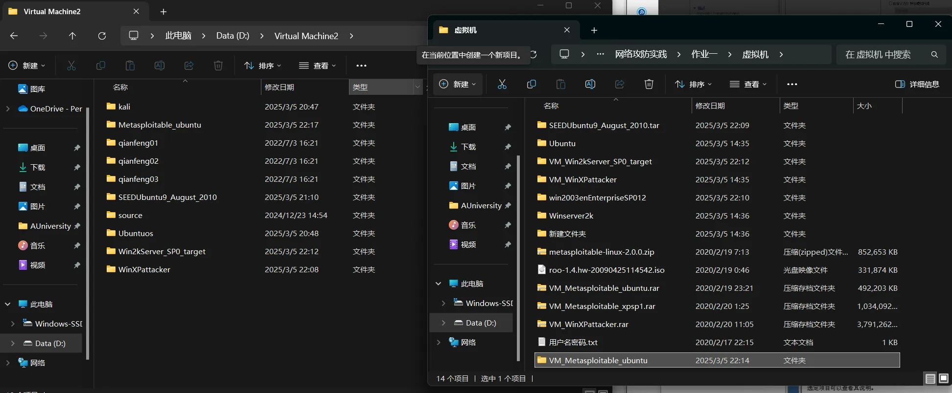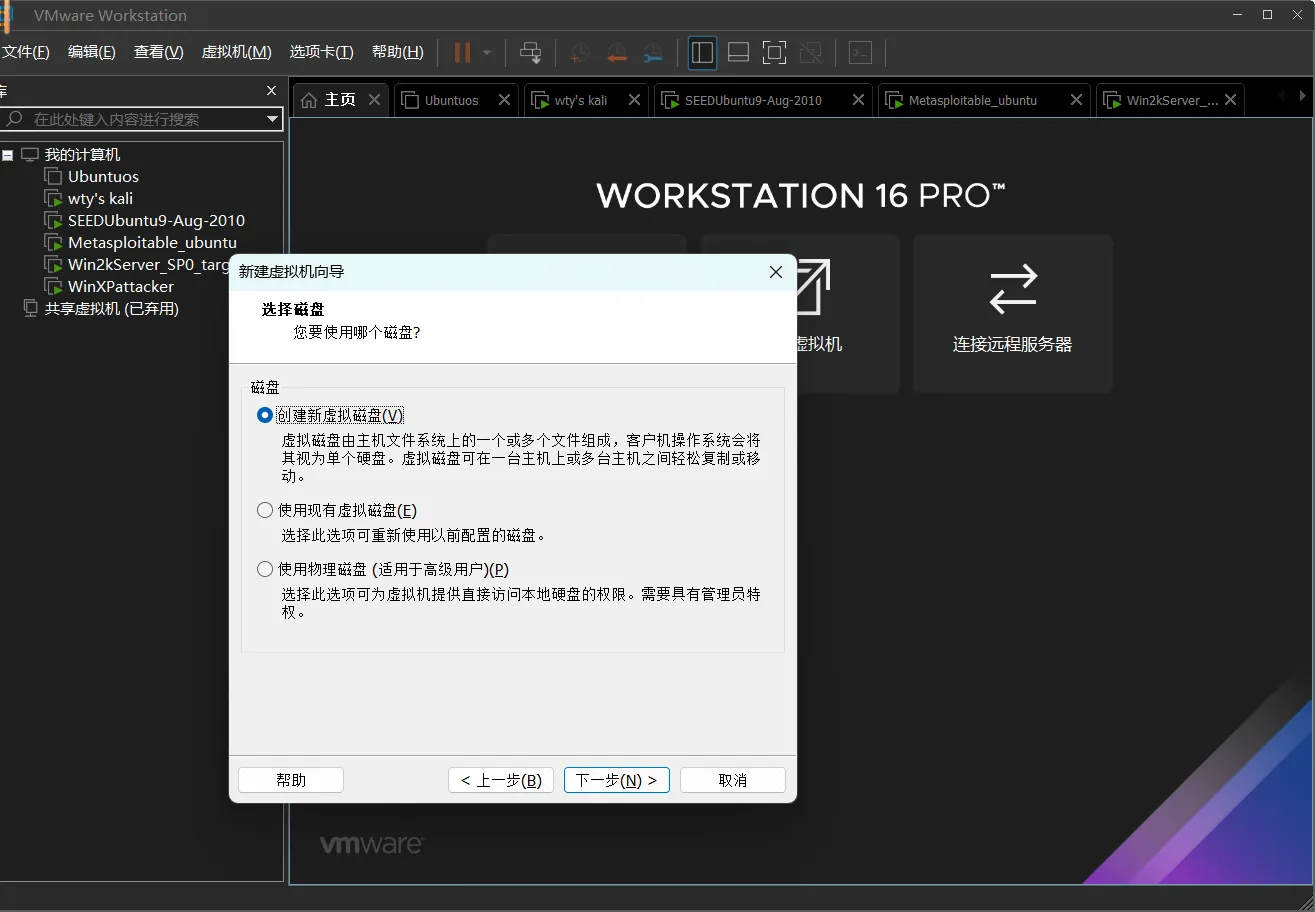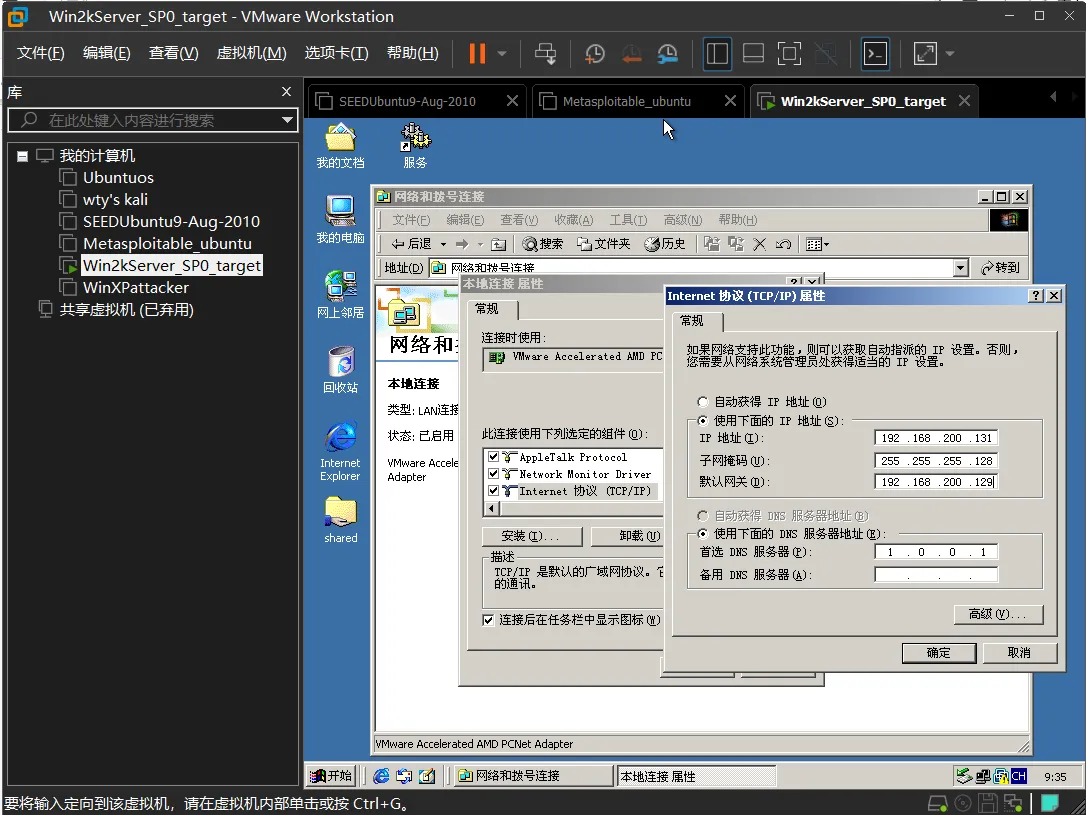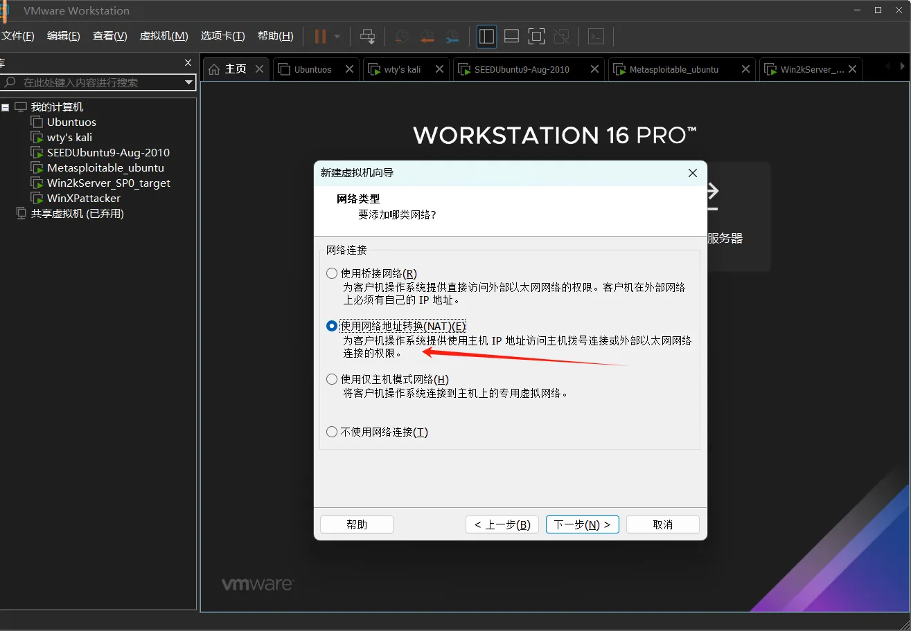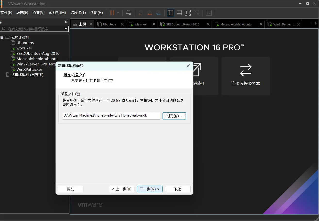 如图所示,导入课堂提供的虚拟机资源,将其复制到本地上的VMware Workstation,其中的攻击机wty's kali是之前我安装好的,这里便省略了kali攻击机的安装过程,其余虚拟机使用了老师提供的资源