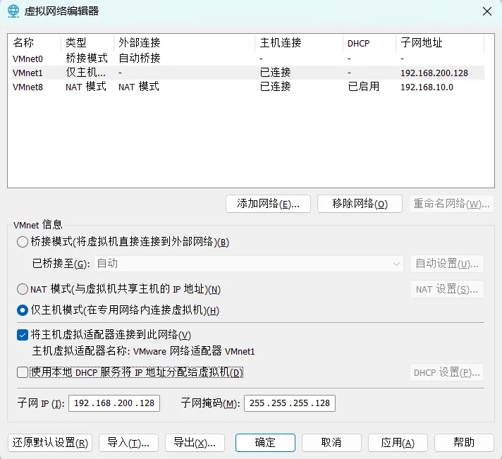 打开VMwareWorkstation的虚拟网络编辑器,使用管理员权限将VMnet1(内网)设置为仅主机模式,设置子网IP为:192.168.200.128,设置子网掩码为:255.255.255.128,并取消其DHCP服务