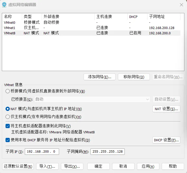 将VMnet8(外网)设置为NAT模式设置子网IP为:192.168.200.0,设置子网掩码为:255.255.255.128