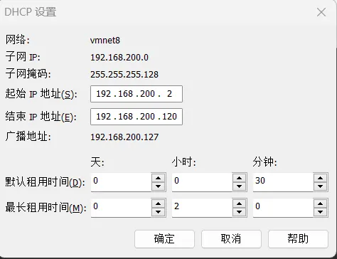 打开VMnet8的DHCP设置,设置起始IP地址为192.168.200.2,结束IP地址为192.168.200.120