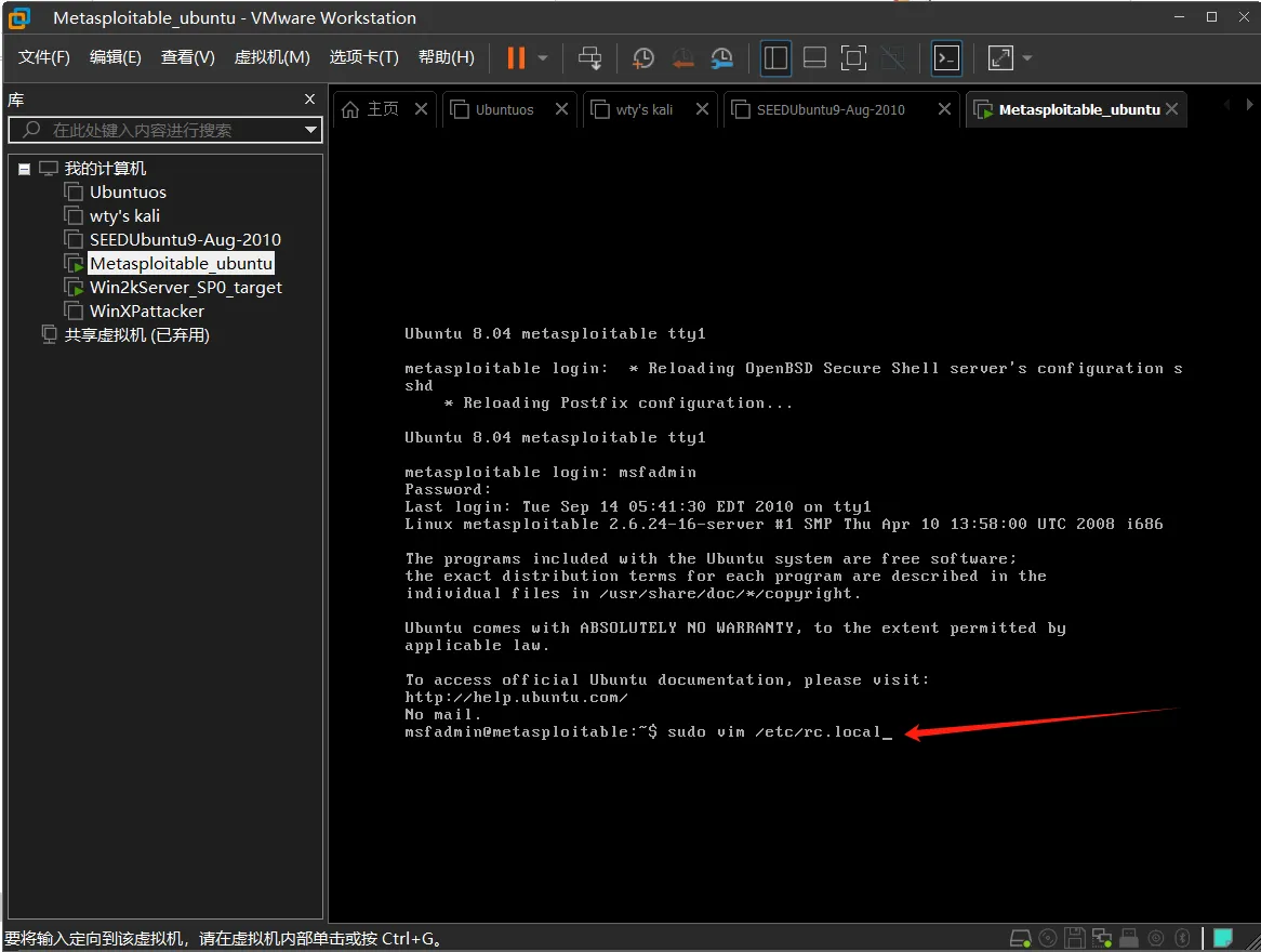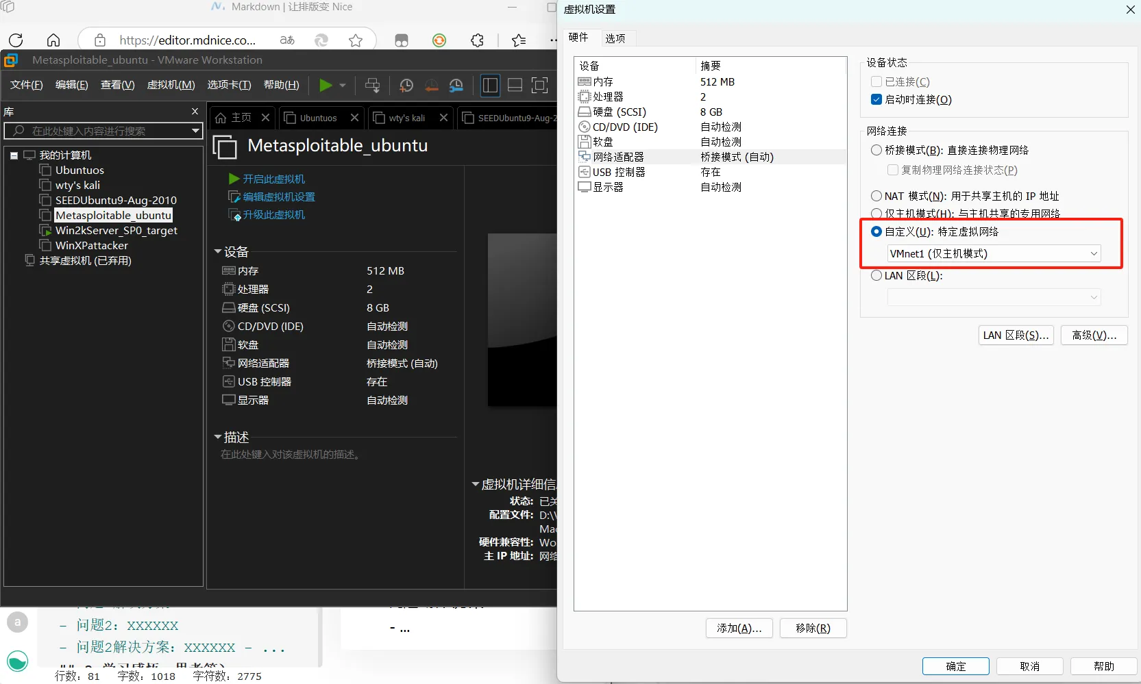 同Win2k靶机,打开虚拟机网络适配器,将Metasploitable靶机连接至内网VMnet1
