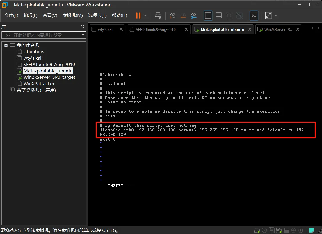 登陆后使用vim打开rc.local文件,进入编辑模式后,添加命令ifconfig eth0 192.168.200.130 netmask 255.255.255.128 route add default gw 192.168.200.129,保存退出后输入命令sudo reboot,重启虚拟机