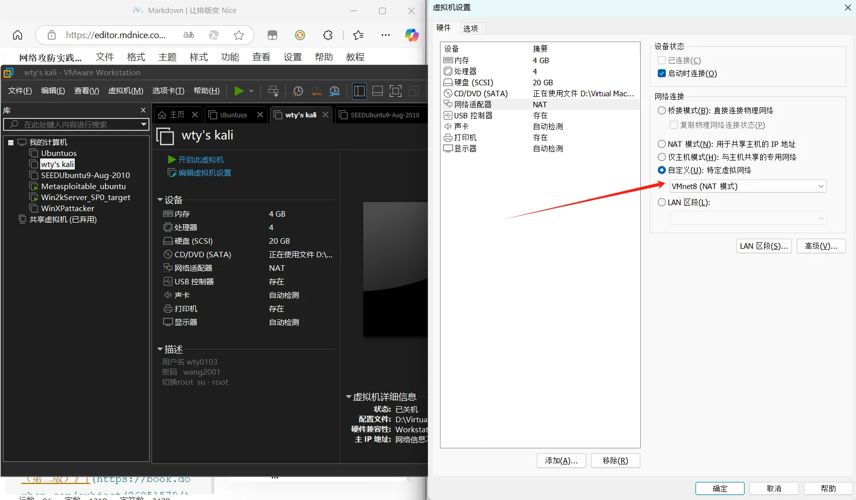 打开虚拟机Kali的网络适配器,将Kali连接到VMnet8(外网)