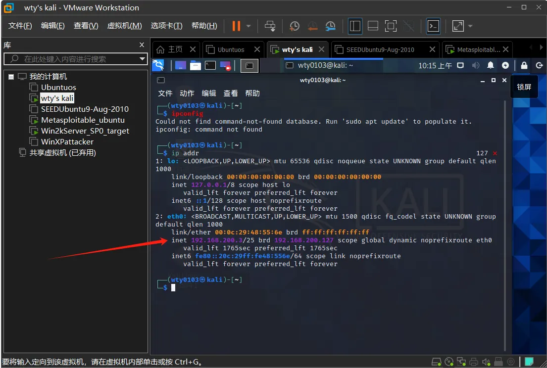 登录Kali后输入命令查看Kali攻击机的网络配置,DHCP分配的IP地址为192.168.200.3处于VMnet8分配的地址网段中,Kali配置成功