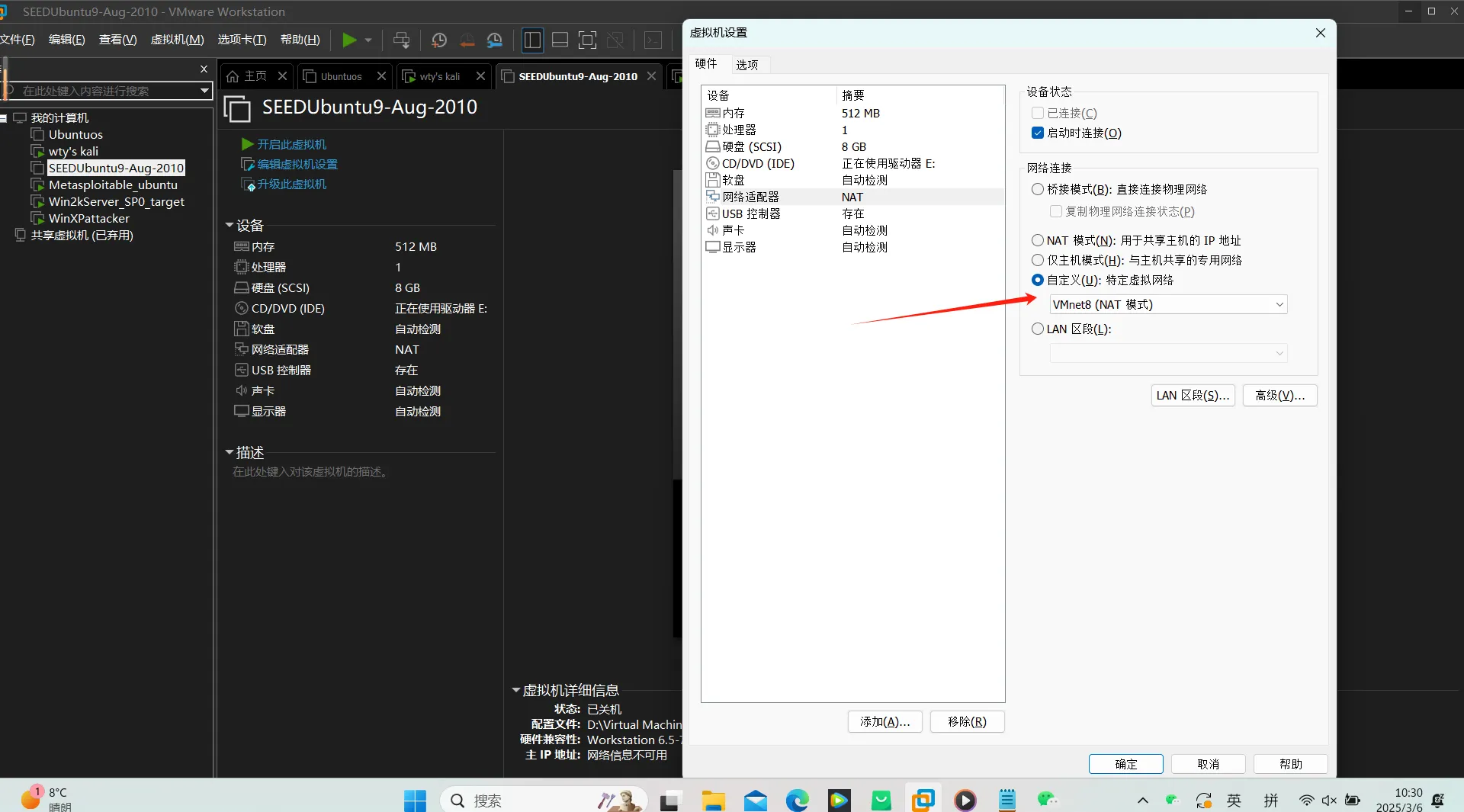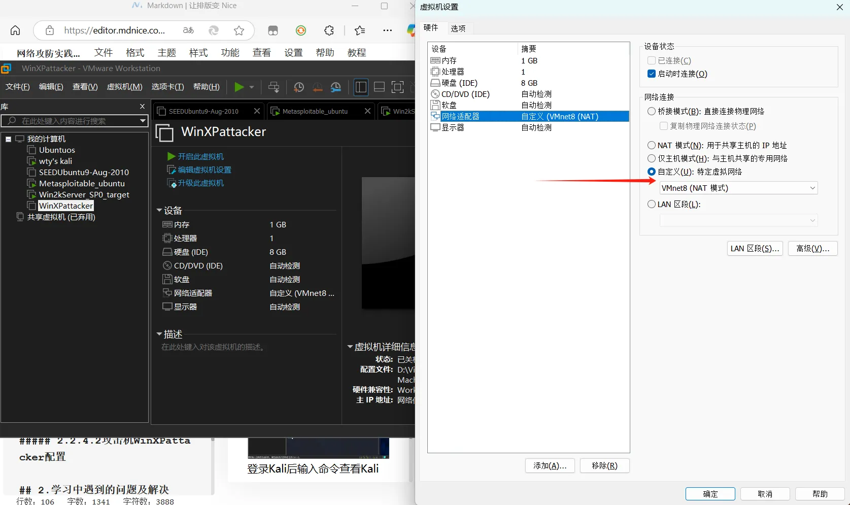 打开虚拟机的网络适配器设置,将攻击机WinXPattacker连接至VMnet8(外网)