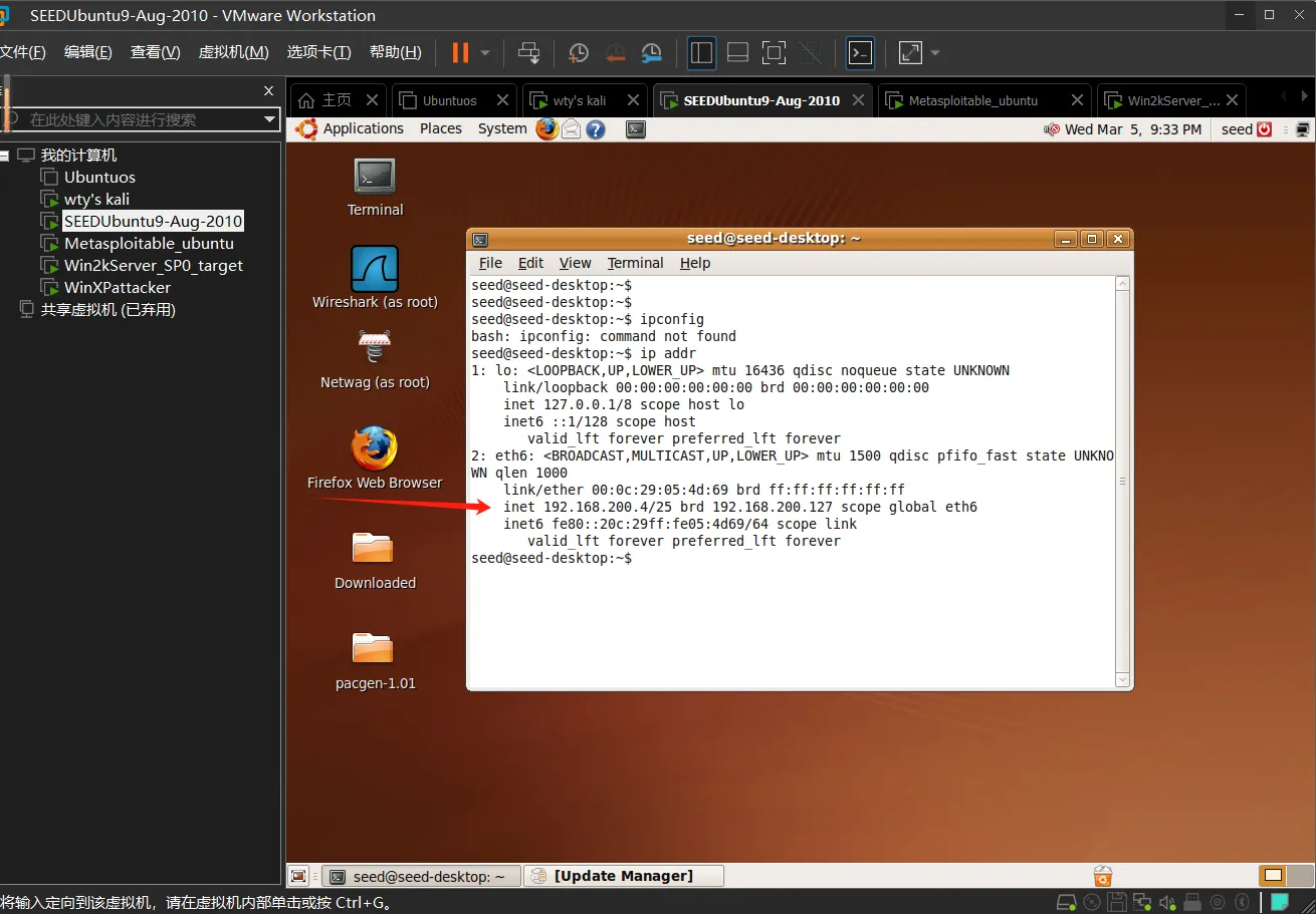 启动SEED虚拟机登录用户后,输入ip addr命令查看SEED的网络配置如图所示,IP地址为192.168.200.4
